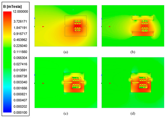 The 2D simulation model of winding structure for MCRWPT is constructed in ANSYS Maxwell, and the circuit is constructed in ANSYS Simplorer to realize co-simulation with ANSYS Maxwell. Excitation frequency of 100 kHz, output power of 15 W, and equivalent load resistance of 100Ω are the common parameters of the simulation. Under the condition that the aforementioned common parameters are determined, the magnetic shielding performance of four different winding structures is compared through simulation. Figure 6 illustrates the magnetic flux density distributions on the XZ plane, which shows half of the magnetic flux density distribution and the other half symmetrical about the z-axis. The maximum limits of the color maps in Figure 6 are identically defined as 12 mT so that the differences in the magnetic flux density distribution between the maps can be compared. The magnetic field distribution shown in Figure 6a shows that the magnetic flux density near the coil is strong. From Figure 6b,c, it can be seen that there are obvious differences in the magnetic field distribution. Due to the directing of the magnetic field by the improved pot core ferrite shielding, the magnetic flux density inside and outside the ferrite structure is significantly reduced. Figure 6d shows the special-shaped ferrite shielding structure to reduce magnetic leakage further.