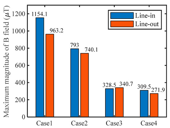 The two maximum magnitudes of the B field simulated along two red measurement lines are shown in Figure 7 to compare the magnetic flux density differences numerically. Taking the Line-in measurement line as an example, the magnetic flux density on the measurement line increases first and then decreases from bottom to top. Analysis of Figure 6 shows a maximum magnetic flux density value near the gap between the primary and secondary windings. The maximum value of the magnetic flux density obtained by the simulation based on Case1 is 1154.1, while the maximum value of the magnetic flux density obtained based on Case4 is 309.5. The maximum magnetic flux density on the Line-in and Line-out measurement lines decreases gradually from Case1 to Case4, as shown in Figure 7. The smaller the maximum magnetic flux density on the measurement line, the better the magnetic shielding performance of the corresponding winding structure under the condition of the same output power.