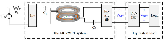 The block diagram of the MCRWPT system is demonstrated in Figure 8. The transmitting circuit and receiving circuit form an MCRWPT circuit. The transmitting circuit comprises DC power , a full-bridge inverter circuit, primary compensation capacitors, and a primary winding. The receiving circuit consists of a secondary winding, secondary compensation capacitors, a full-wave rectifier, a filter circuit, and equivalent load resistance. represents the equivalent load resistance here, including a DC-DC converter and load. The primary compensation capacitor is connected in series with the primary winding, and the secondary circuit has the same structure as the primary circuit. The DC-DC converter stabilizes the output voltage and reduces the ripple of the output voltage supplied to the load, which is the IMU. Here, represents the output voltage of the MCRWPT system, and represents the load voltage output by the DC-DC converter.