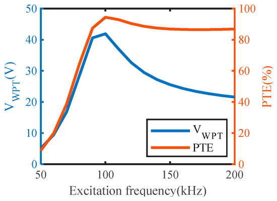 The second step is to determine the excitation frequency corresponding to the maximum TTE by analyzing the influence of excitation frequency on the TTE based on the Case4 model. The resonance frequency of the MCRWPT system is 100 kHz, and the equivalent load resistance is fixed at 50 Ω. For the same output voltage, the higher the excitation frequency, the higher the PTE, as shown in Figure 10. Therefore, the case where the excitation frequency is greater than the resonant frequency is analyzed below.