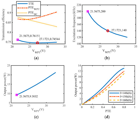 As shown in Figure 11c, the TTE reaches its maximum when the output voltage is 21.57 V, and the output power of the MCRWPT system reaches a minimum of less than 10 W. The output power is positively correlated with the output voltage, and the excitation frequency is negatively correlated with the output voltage. Therefore, the output power can be improved by reducing the excitation frequency, but the TTE decreases.