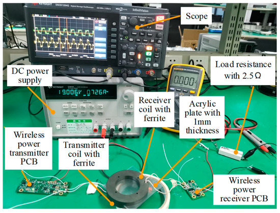 An experimental platform was implemented to verify the effectiveness of the theory and simulation, as shown in Figure 12. The experimental platform comprises a DC power supply, a wireless power transmitter PCB, a transmitter coil with ferrite, a receiver coil with ferrite, a wireless power receiver PCB, load resistance, and an acrylic plate with 1 mm thickness. The magnetic shielding performance of Case3 and Case4 is similar, with a fixed distance between primary and secondary windings. It can be seen from Table 3 that the coupling coefficient of Case3 is smaller than that of Case4. Therefore, the MCRWPT system based on Case3 has a higher output power capability under the same gap, and the structure of Case3 is simple and easy to process. Hence, the experimental winding structure is the same as Case3. Litz wire was used to form the two coils. The transmitting coil has six turns of Litz wire made with 105 strands of American-wire-gauge 40, and the receiving coil is the same as the transmitting coil. The coil parameters measured by the precision LCR digital bridge TH2838H are shown in Table 4. Compared with the simulation results of Case3 in Table 3, there are errors in the coil parameters tested in the experiment, which may be caused by inaccurate simulation modeling. However, it does not affect the analysis of system characteristics through simulation.