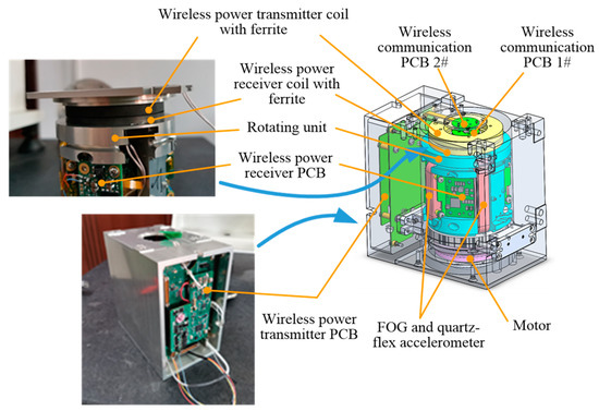Rotation modulation technology is an effective method to improve the accuracy of inertial navigation systems (INSs) at a low cost [1]. This technology can suppress constant or slow variation errors of inertial devices by rotating the inertial measurement unit (IMU) continuously or periodically [2]. Therefore, the power supply to the rotating part is a key technology. If the rotation scheme is set to continuous rotation or run-stop in forward and reverse directions, winding reels can be used to transmit electrical energy from the stationary unit to the rotating unit. However, wired electrical energy transfer can damage safety under loss of indexer control and restrict the free rotation of rotating parts in the rotation modulated inertial navigation system (RMINS). Therefore, applying slip-rings to solve the cable winding problem is a common method for the power supply of rotating units [3]. Nevertheless, slip-rings have the drawbacks of wear and friction, limited lifetime, and regular maintenance [4]. Based on these problems, applying wireless power transfer (WPT) technology to the RMINS is necessary to power the rotating units through a non-contact method.