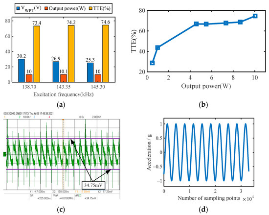 (a) System characteristic parameters at different excitation frequencies measured by experiment; (b) The relationship between TTE and output power under f = 145.3 kHz; (c) The ripple of output load voltage; (d) An accelerometer’s measurement with the motor continuously rotating.