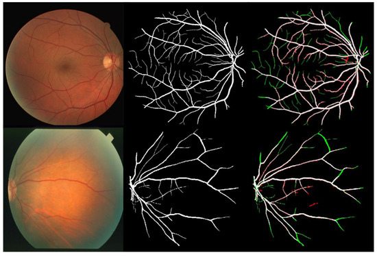 - Hoover, A.; Kouznetsova, V.; Goldbaum, M. Locating blood vessels in retinal images by piecewise threshold probing of a matched filter response. IEEE Trans. Med. Imaging 2000, 19, 203–210. [Google Scholar] [CrossRef] [PubMed] [Green Version]