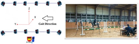 The horse’s gaits, such as Walk and Canter, were motion-captured before and after the saddle horse conversion training. The rider only guided the horse to the route of motion capture, allowing the horse to Walk and Canter. Only one rider participated in the experiment because the gait could be changed depending on the rider’s ability to control the horse. For saddle fitment, a saddle fit expert, who is a professor of the equestrian department, fitted the saddles for all participating horses. Also, sufficient preparation time was provided to the riders before the start of motion capture, and the data collection was started based on the rider’s judgment that the horse was stable and it was easy to enter the route. Walk and Canter were performed twice each as shown in Figure 2, and the results were analyzed.