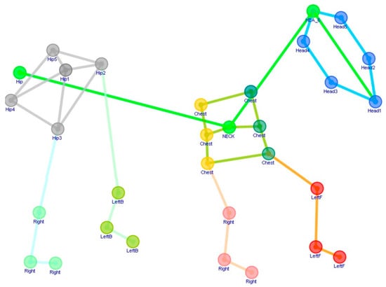 An MX-13 Vicon™ motion capture system (Vicon, Ltd., Oxford, UK), including twelve high-speed cameras (Sampling frequency: 200 Hz) and MX control interfaces, was used to record the locations of the reflective markers on the horses’ bodies. The 28 retro-reflective markers were placed at the following anatomical locations (Figure 1): the end part of nasal bone (Head1); left part between eyes (Head2); right part between eyes (Head3); right cranium (Head4); left cranium (Head5); middle of right scapula (Chest1); middle of left scapula (Chest2); head of left humerous (Chest3); head of right humerous (Chest4); right elbow joint (Chest5); left elbow joint (Chest6); top and intersection of R/L pelvis (Hip1); left point of hip (Hip2); right point of hip (Hip3); right side of right ischium (Hip4); left side of left ischium (Hip5); lateral of left carpus (LeftFrontFoot1); posterior of left and front sesamoid(fetlock) bone (LeftFrontFoot2); lateral and middle of left and front long pastern bone (LeftFrontFoot3); lateral of right carpus (RightFrontFoot1); posterior of right and front sesamoid(fetlock) bone (RightFrontFoot2); lateral and middle of right long pastern bone (RightFrontFoot3); lateral of left tarsus (LeftBackFoot1); posterior of left and hind sesamoid(fetlock) bone (LeftBackFoot2); lateral and middle of left long pastern bone (LeftBackFoot3); lateral of right tarsus (RightBackFoot1); posterior of right and hind sesamoid(fetlock) bone (RightBackFoot2); and lateral and middle of right long pastern bone (RightBackFoot3). In addition, three virtual markers calculated using retroreflective markers are as follows: middle of Head4 and Head5 (HEA_6); middle of Chest3 and Chest4 (NECK); and middle of Hip4 and Hip5 (Hip). The marker coordinates were used to model the body with a combination of several rigid segments connected by frictionless joints as shown in Figure 1.