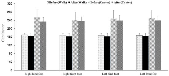 Figure 4 shows the stride lengths of each foot during Walk and Canter. All stride lengths of Walk and Canter decreased after the saddle horse conversion training. However, there were no statistical differences in stride lengths before and after the saddle horse conversion training.