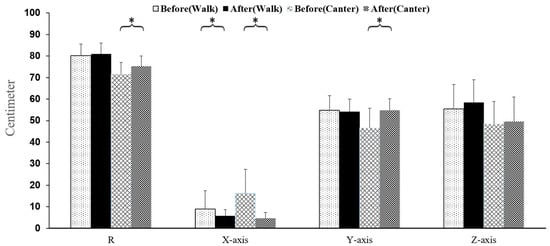 To analyze the displacements between the center of the head and the center of the neck, the average composite displacement from the center of the head to the center of the neck and the average displacement on the x-axis, y-axis, and z-axis were calculated. There were statistically significant differences in the average displacement on the x-axis in Walk after retraining (before: 8.94 cm, after: 5.85 cm, p = 0.040) and in Canter in the average composite displacement from the center of the head to the center of the neck (before: 71.69 cm, after: 75.32 cm, p = 0.044), the average displacement on the x-axis (before: 16.18 cm, after: 4.62 cm, p = 0.001), and the average displacement on the y-axis (before: 46.68 cm, after: 54.82 cm, p = 0.000) after retraining as shown in Figure 5.