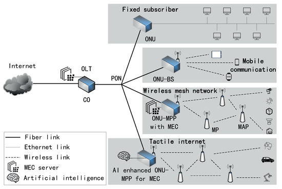 The tactile internet involves enormous, wide-area-distributed sensors/machines. Wire and wireless access networks are essential [4]. The fiber-wireless (FiWi) network is one of them, as shown in Figure 1, which integrates the wired fiber backhaul and wireless fronthaul. In the wired fiber backhaul, a tree-like topology with the IEEE 802.3 ah/av 1/10 G passive optical network (PON) protocol that connects the central optical line terminal (OLT) to four optical network unites (ONUs) is adopted. To provide fiber-to-the-home/building/road (FTTx) services to fixed subscribers, an ONU is located at subscriber communities (i.e., the first sub-network). This fixed method is not relevant to the main content of this work. The second sub-network is equipped with a based station (BS)-aided ONU (i.e., ONU-BS). The mesh portal point (MPP)-aided ONU (ONU-MPP), the mesh point (MP), and the mesh access point (MAP), are deployed to host IoT services in the third sub-network. Note that multi-access edge computing (MEC) can be used on ONUs. Finally, some computing-centric tasks can be offloaded onto MEC for the tactile services. This scenario forms the background of our work.