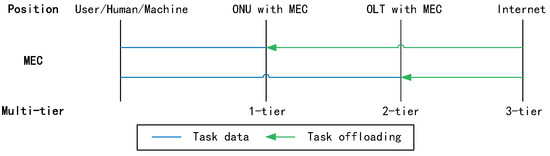 As shown in Figure 2, four kinds of location are involved in the FiWi network scenario. These four kinds of location, in order of the distance from users, are user/human/machine, ONU with MEC, OLT with MEC, and the Internet. The ONU with MEC is seen as one-tier. The OLT with MEC is seen as two-tier. Internet is seen as three-tier. The computing services traditionally occur on the Internet. The task data have to be transmitted in sequence through user/human/machine, ONU, OLT, and the Internet. After data computing, results or response contents return from the Internet to the user/human/machine. With the application of MEC, data computing can migrate from the Internet to ONU with MEC or OLT with MEC, i.e., the task offloading in Figure 2. The path that involved service reductions from user/human/machine-ONU-OLT-Internet to user/human/machine-ONU or user/human/machine-ONU-OLT. Latency is reduced due to the migration of data computing (i.e., task offloading) from the Internet to ONU with MEC or OLT with MEC. The MEC in ONU (i.e., one-tier) is denoted as MEC-1. The MEC in OLT (i.e., two-tier) is denoted as MEC-2. The original data computing on Internet (i.e., three-tier) is denoted as MEC-3.
