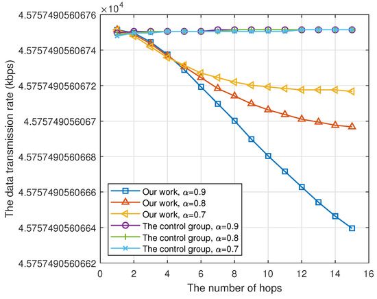 With the increase in hop number, the transmission rate of our work decreases. This is the result of the multiple hops’ multiplication effect. For the same reason, the larger is, the stronger the downward trend of the data transmission rate. For each situation in Figure 3, the smallest value is 99.9999% of the largest value. The difference is negligible.