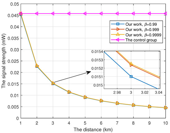 For each distance in our work, the situation with the greatest has the largest signal strength. In addition, the signal strength of our work is always than that of the control group, because the fiber link in the control group is ideal.