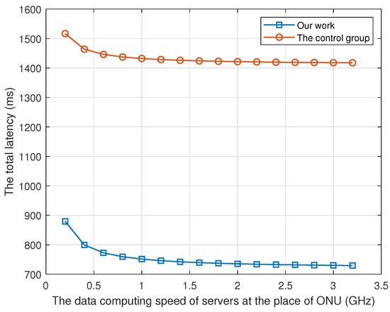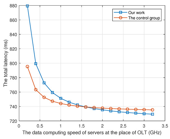 In Figure 6, the total latency of our work has a crossover point with that of the control group. The data-computing speed of servers at the place of OLT is 1.6 GHz when two lines cross. The reason for this is that MEC-2 offload can provide a trade-off between shorting paths and increasing offloading locations. Before this point (≤1.6), the total latency of our work is larger than that of the control group. After this point (≥1.6), the total latency of our work is smaller than that of the control group. In addition, whether our work or the control group, the total latency decreases with the increase in data-computing speed.