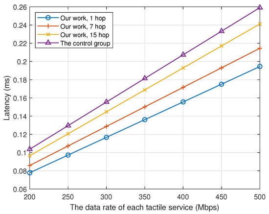 With the growth in the data rate of each tactile service, the latencies of different situations always increases. The control group has the largest values. The larger the hop number, the greater the latency of our work. The multiple hops in the wireless mesh network form a complex network with redundant paths. The existence of communication among ONUs makes the data transmission path short, from user-ONU-OLT-ONU-user to user-ONU-another ONU-user. This is the reason that the latency of our work with 1 hop is still smaller than that of the control group.