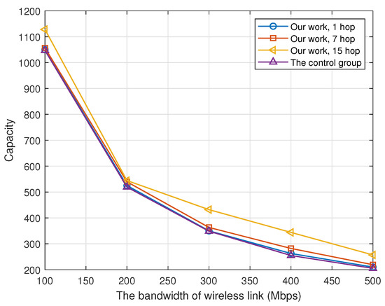 In Figure 8, our work with 15 hops showed the greatest capacity compared with our work (1 hop), our work (7 hops), and the control group. A greater hop means that the wireless mesh network has a more redundant path. By offloading the computing task for tactile internet services from the Internet, or OLT to the ONUs closer to users, the capacity of the entire network can grow. When the bandwidth of wireless links increases, the capacities of different situations all decrease. The total bandwidth of the entire network is limited; the bandwidth of a tactile internet service leads to small capacity. For a fixed bandwidth in the wireless link, such as 400 Mbps, our work with one hop still has a higher capacity compared with that of the control group.