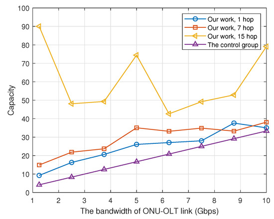 The capacity with different fiber bandwidths from ONUs to OLT is shown in Figure 9. In the WDM-based PON network, the bandwidth of the ONU-OLT link is [1.25, 2.50, 3.75, 5.00, 6.25, 7.50, 8.75, 10.00] Gbps. The bandwidth of each tactile internet service is 300 Mbps. The control group has the lowest capacity and a relatively stable increase rate. The reason for this phenomenon is that the wireless network of the control group only has a single hop. This means that the tactile internet service distribution has no choice of candidates. By contrast, our works with different hops all have more fluctuating curves. As the hop number grows, the candidate paths in the wireless mesh network increase. Our work with the largest hop has the most fluctuating curve. These fluctuations in our work are caused by the variety of offloading schemes.