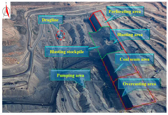 Heidaigou open-pit mine is the only open-pit mine in China that adopts cast blasting–dragline stripping technology. After 14 years of technology introduction, absorption, digestion, and innovation, Heidaigou open-pit mine has rich on-site practical experience in applying this technology. At present, the stope has advanced to the second mining area (as shown in Figure 1). With the continuous downward and forward advance of the stope, the coal seam rises and falls steeply, the rock characteristics are changeable and difficult to control, and the parameters of the cast blasting step are complex and changeable, which leads to uncertainty of the form of cast blasting. However, cast blasting stockpile form and the effective rate of blasting, dragline operation efficiency, and the overcasting stripping system are closely related to the overall production cost calculation, the subsequent dragline stripping steps’ parameter design and equipment operation, and the production organization of the personnel and equipment allocation, which makes determining the influence on the overcasting stripping system integration design incredibly difficult. Due to this, the Heidaigou open-pit mine often features a coal mining link and stripping link that cannot be synchronized, production organization and management of the personnel and equipment allocation that cannot be guaranteed in time, and a coal seam reveal speed that is always advanced or delayed (and thus causes the overall development of a seriously disturbed stope), all of which affect the open-pit mine’s production schedule and plan.