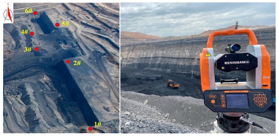 A Quarryman high-precision laser scanner (equipment parameters are shown in Table 1) was used in this study for the selection of the data acquisition location (as shown in Figure 2). Positions 1 and 6 mainly assist in scanning goaf and cast blasting stockpile; positions 3 and 4 mainly scan high steps adjacent to goaf and cast blasting stockpile; and positions 2 and 5 mainly scan goaf and cast blasting stockpile to obtain 3D point cloud data for each scanned area.