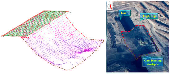 To ensure that reconstruction after cast blasting stockpile profiling is consistent with the real cast blasting stockpile profile, first, the cast blasting stockpile profile is removed according to the integration of the relationship of space and time and position of cast blasting; then, automatic proofreading occurs for each group of cast blasting stockpile profile coordinates. Next, proofreading occurs for the cast blasting stockpile slope top line and bottom line, goaf, and high step slope line point cloud data, such as the implementation code (as shown in Table 2). The information for the explosion stack with code is imported into AutoCAD and then transformed into a cast blasting stockpile profile that is easy to edit, operate, and calculate.