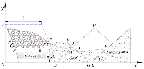 where SBu is the sectional area of cast blasting stockpile profile, m2; α represents the slope angle of the rock step, °; B represents the width of the cast blasting step, m; β represents the slope angle of the coal seam step, °; Hm is the height of the rock step, m; Hm is the height of the coal seam step, m; R represents the angle of rest about materials; and xE and xD represent the abscissae of E and D, respectively.