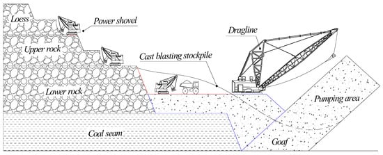 As the most mainstream mining technology used in open-pit mines worldwide, cast blasting–dragline stripping technology (hereinafter referred to as the overcasting stripping system) is favored in open-pit mines because of its characteristics of environmental protection, economic efficiency, etc. As a cutting-edge engineering problem, the integrated design of the overcasting stripping system has long been the focus of attention in open-pit mines, especially the determination of the form of a cast blasting stockpile. On the one hand, the cast blasting stockpile form determines the effective throw rate and affects the operation efficiency and production benefit of dragline stripping technology. On the other hand, the cast blasting stockpile form plays a decisive role in the dragline stripping step parameter design, equipment operation area division, field personnel and equipment allocation, and other production organization management issues in dragline stripping technology. Therefore, the determination of the cast blasting stockpile plays a crucial role in the integrated design of the whole overcasting stripping system.
