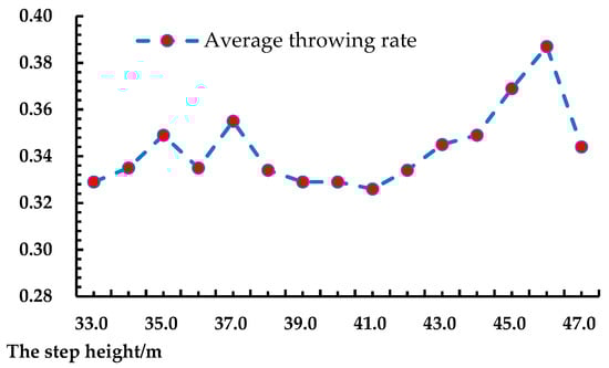 The research results for an open-pit mine company in South Africa show that [26] whether the optimal throwing effect is achieved largely depends on the ratio ε between step height H and step width B, and the effective throwing rate γ is positively correlated with ε. After entering the second mining area, the width of each cast blasting step basically remains the same, and the width of the cast blasting step floats at 85 m. Therefore, this paper only focuses on the step height as the feature object. According to the statistics on the step height of cast blasting (as shown in Figure 9), the step height is mainly distributed in the range 33 m to 48 m. To avoid erroneous research results due to the difference in samples with different step heights, we divided the step heights into three characteristic indexes: 35 m (35 ± 2.5 m), 40 m (40 ± 2.5 m), and 45 m (45 ± 2 m).