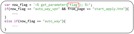 Shared keywords are keywords that use the same name in the front-end web file and the back-end binary file. With the help of this sharing phenomenon, we can statically parse the firmware web file, extract all possible parameters, and determine whether these keywords are shared. Because shared keywords will be substituted into the back-end binary files, we can assume that shared keywords are more likely to be vulnerable. Among all the parameters transmitted by the front-end, not all parameters will be passed to the back-end for processing. Some of the parameters will be used for logical judgment, as shown in