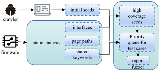 First, we decompress the firmware. Then, through the static analysis, we can obtain the interfaces, page paths, and shared keywords dictionary. After that, we emulate the firmware. The web crawler automatically traverses all the function entries of the web interface through the proxy and uses the request captured as the initial seeds. For the interfaces and page paths obtained in the static analysis of the firmware, if they do not exist in the seed queue, the crawler will crawl and parse the interfaces and pages, then add them to the seed queue to obtain a high-coverage seed queue. Using the shared keyword dictionary, we calculate the weight information of the seed queue, then mutate the seeds with higher weights first, and, finally, generate the seed priority queue. Next, the fuzzer performs fuzzing in the order of the priority queue and finally outputs a vulnerability report.