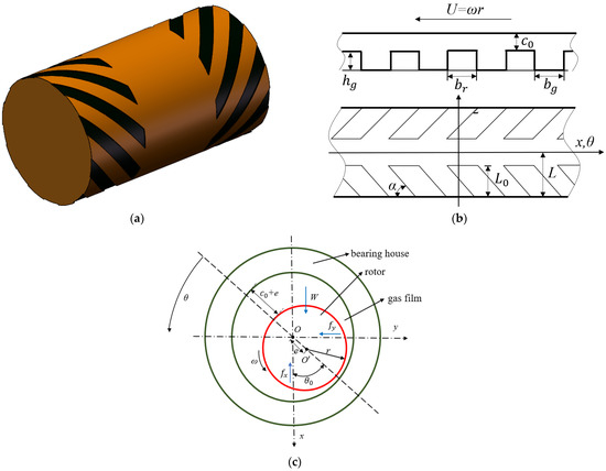 The structural diagram of the bearing is shown in Figure 1. The structural parameters of the bearing are listed in Table 1. The key parameters of the structure are groove angle α, number of grooves N, groove depth , film clearance , eccentricity e, groove circumferential ratio , and groove axial ratio .