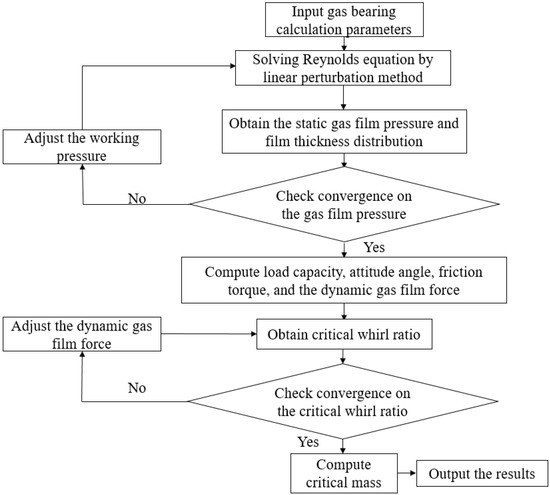 The calculation flow chart for this method is shown in Figure 2. First, the calculation parameters are input. The Reynolds equation is solved using the linear perturbation method, and the static gas film pressure and thickness distribution are obtained. Then, the convergence for the gas film pressure is checked. After the pressure converges, the load capacity, deflection angle, friction moment and dynamic gas film force are computed. Next, the critical whirl ratio is calculated, and its convergence is checked. Afterwards, the critical mass is computed. Finally, the calculation results are output.