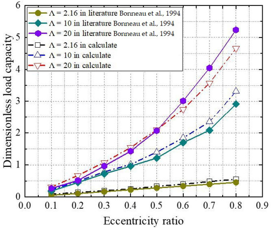 To verify the model, the results obtained using the model are compared with those found in the literature [29]. The dimensionless load capacities of bearings with different eccentricity ratios under different numbers of bearings are shown in Figure 3. The calculation results presented in this paper are in good agreement with the data presented in the literature. The maximum relative error is less than 10%.