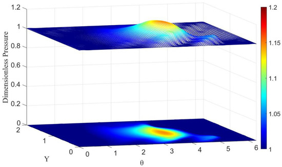 The dimensionless pressure field of a hydrogen gas bearing (ambient pressure of 0.5 MPa and ambient temperature of 300 K) is shown in Figure 4. The high-pressure zone is in the area where θ is around 3.2 (radian system). The maximum dimensionless pressure is about 1.16.