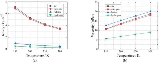 (a) Density and (b) viscosity of air, nitrogen, helium, and hydrogen with temperature (0.3 MPa).