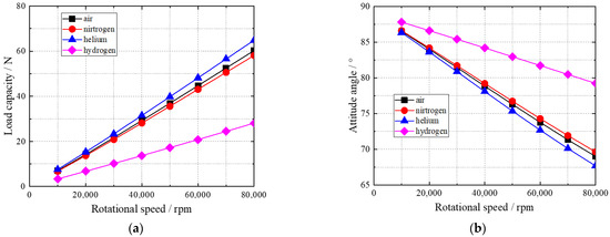Bearing load capacities and attitude angles with rotational speed using different gases are shown in Figure 6. The bearing load capacity exhibits a linear growth trend with rotational speed. The bearing load capacity decreases in the order of helium, air, nitrogen and hydrogen. Moreover, the bearing capacities of air-, nitrogen- and helium-lubricated bearings become closer, and are far higher than that of the hydrogen gas-lubricated bearing. Throughout the whole speed range, the attitude angle of the hydrogen gas bearing is the largest.