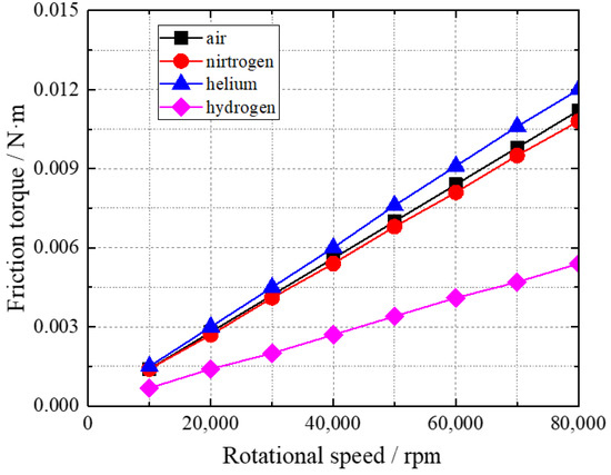 The friction torque with rotational speed obtained for the four different gases is shown in Figure 7. The values of bearing friction torque using air, nitrogen and helium are relatively close to one another. Throughout the whole speed range, the bearing friction torque using hydrogen is the lowest. In addition, the friction torque increases linearly with rotational speed.