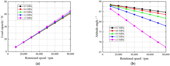 The bearing load capacity and the attitude angle of hydrogen gas bearings with ambient pressure are shown in Figure 9. The load capacity increases slightly with increasing ambient pressure. Therefore, it is feasible to improve the bearing load capacity by increasing the ambient pressure. At the same time, the bearing attitude angle decreases gradually.