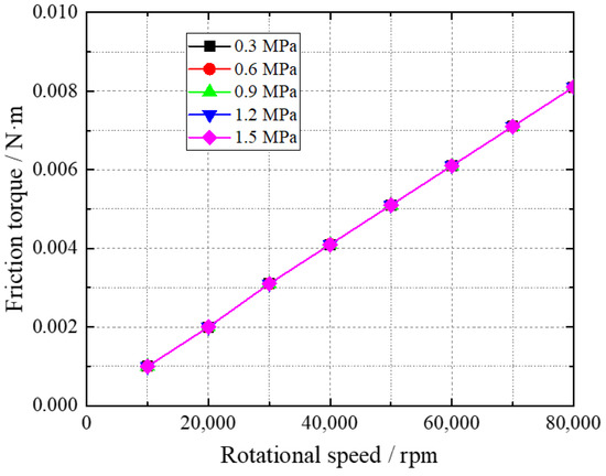 The friction torque of hydrogen gas bearings with ambient pressure is shown in Figure 10. The ambient pressure has a limited effect on the friction torque of the bearing. The friction loss is basically invariant with increasing ambient pressure.
