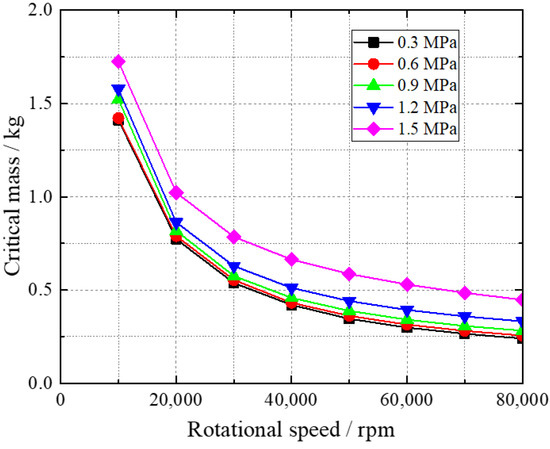The critical mass of hydrogen gas bearings with ambient pressure is shown in Figure 11. Higher ambient pressure leads to increasing critical mass. Overall, increasing the ambient pressure is also an effective method of enhancing the performance of hydrogen gas bearings.