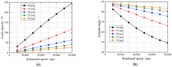 Bearing film clearance has a great influence on the formation of wedge-shaped clearance, which directly affects bearing performance. The effects of different values of film clearance on bearing performance are calculated, while other parameters remain unchanged, as shown in Table 1. The load capacity and the attitude angle of hydrogen gas bearings with different film clearances are shown in Figure 12. The bearing load capacity increases with smaller values of gas film clearance. In addition, the difference in load capacity under different gas film clearance becomes greater at higher rotational speeds. Decreasing the gas film clearance is very effective for enhancing the bearing load capacity. Simultaneously, with decreasing gas film clearance, the bearing attitude angle exhibits a gradual decrease. The decrement of attitude angle increases with rotational speed.