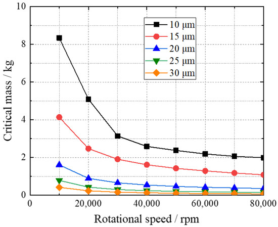 The critical masses of the bearings with rotational speed for the four different gases are shown in Figure 8. When the rotational speed is low, the critical mass is relatively high. The critical mass begins to decrease with increasing rotational speed. The critical mass of the helium-lubricated bearing is close to those of the air- and nitrogen-lubricated bearings, and all of them are higher than that of hydrogen-lubricated bearing. The critical masses of the bearings when using different gases can be ordered from high to low as: helium, air, nitrogen and hydrogen.