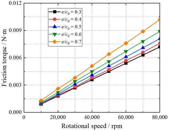 The friction torque of the hydrogen gas bearing with eccentricity ratio is shown in Figure 16. The friction torque of hydrogen gas bearings increases with increasing eccentricity ratio. In addition, the difference in friction torque under different eccentricity ratios increases with rotational speed.