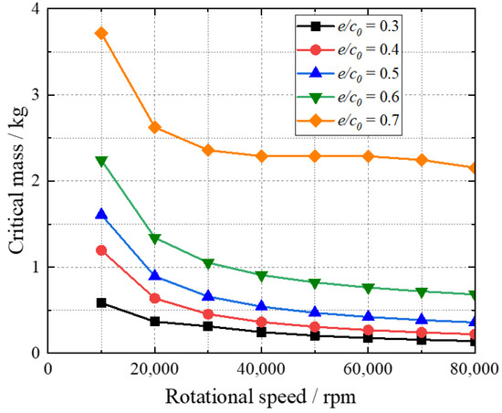 The critical mass of hydrogen gas bearings with eccentricity ratio is shown in Figure 17. The critical mass of the hydrogen gas bearing increases with eccentricity ratio, and thus exhibits improved dynamic performance and stability.