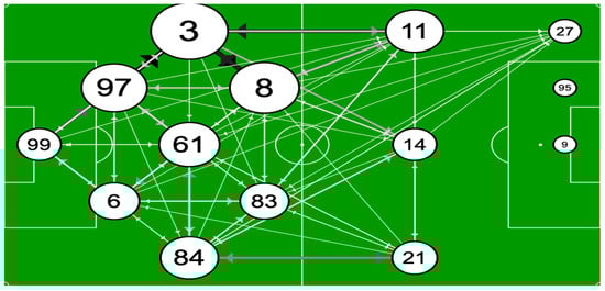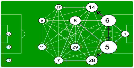 For Team B, Figure 3 shows that the Centroid Player was Player 5 (Table A2, Table A4, Table A6, Table A8 and Table A10). He played as center-back, effecting 48 interactions in the first half, most of them with player 6.