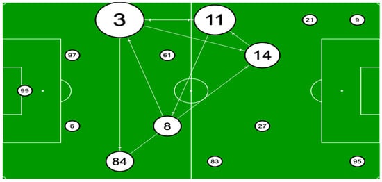 Figure 2 presents the network display of team A in critical event B4. Here, Centroid Player remained Player 3. He kept his playing position, having interacted two times, once with player 84, and another with player 14, during this event.