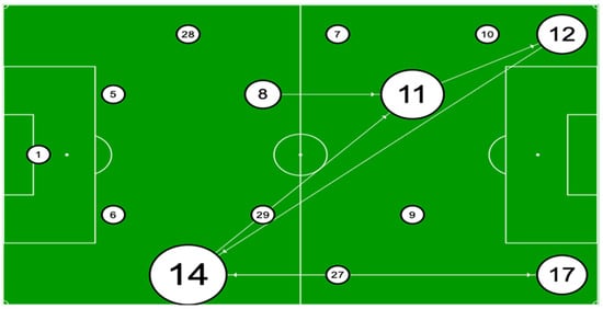 Martins et al. [10], upon applying a mathematical model to a case study in football in the Champions League Finals, through the Bayesian approach to the study of passing sequence, realized that the winning team presented greater values for both individual and team transition entropies, which showed that greater levels of unpredictability could bring teams closer to the win. On the other hand, the number of links between players tend to display a power law distribution, with a few players concentrating more actions [11], pointing that the centroid player should be considered in the match performance analysis. Considering this, Clemente et al. [12] performed a revision to the Centroid Player methodology (that is, the athlete who contributes the most for the connectivity levels of the team), concluding that the inclusion of both the players’ and ball’s positions allowed for a greater comprehension of the team’s behaviors, improving the game’s analysis and making fast decision-making possible in the middle of games. Additionally, Gama et al. [13] analyzed the network of interactions resulting from the collective behavior of professional football teams through the centroid player and networks connections, concluding that the interaction of the centroid players, in the offensive phase of the game happened through the formation of vertices that were connected by links, which were mainly “orchestrated” by the action of centroid players. Therefore, taking into account the match key moments, the region where players’ interactions occur and the relationships established are crucial for a better understanding of the game [11,13,14].