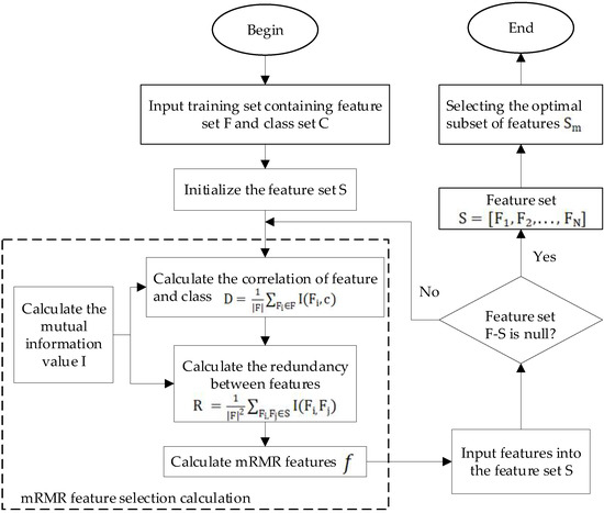 First, the feature set S is initialized to be empty, and the input training dataset contains the feature set F and the class set C. For data containing N-dimensional features, the sorted feature list is obtained by a cyclic process of N iterations. In each iteration, one feature is selected. This feature has the maximum relevance to the target variable compared to other features while having the minimum redundancy with other features that have been selected.