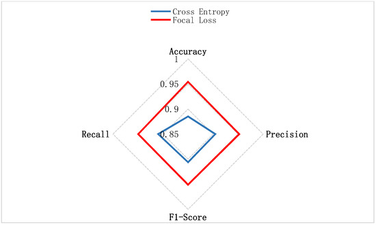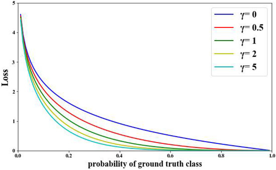 In Equation (9), is the focus parameter for focusing on hard-to-identify samples. i is the number of training samples and is the prediction probability of the label. When = 2 and is close to 1, the value of will be close to 0, and the more accurate the prediction is. When is close to 0, will be close to 1, and the more inaccurate the prediction is. In summary, easily identifiable samples will have smaller weights and hard-to-identify samples will have larger weights.