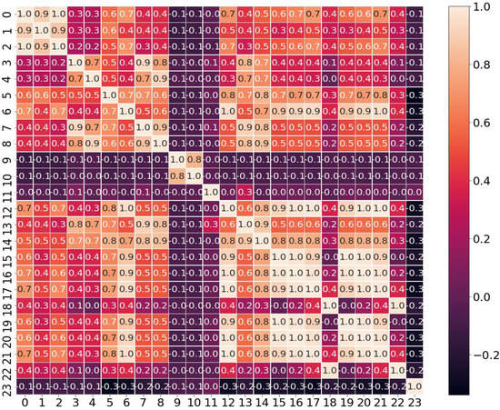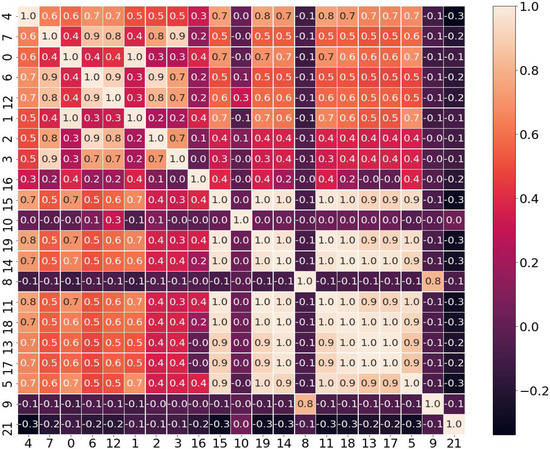 When the absolute value of Pearson’s correlation coefficient is close to 0, the correlation between features is low, whereas the correlation between features close to 1.0 is higher. The mRMR feature selection removes feature numbers 1 and 14, respectively. It can be seen from Figure 11 that the correlation between feature numbers 1 and 2 is 0.9, and the correlation between feature numbers 14 and 13 is 0.9. Both pairs of features have a high correlation, which proves the feasibility of the mRMR feature selection results. The correlation between features of the encrypted traffic data after mRMR feature selection is lower than the correlation between features before going through this experiment. So mRMR feature selection on this dataset can make the redundancy between features reduced while ensuring the maximum correlation between features and classes. This method also solves the problem of feature redundancy that exists in the original data.