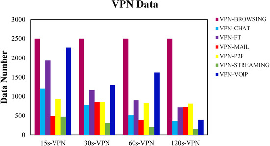 In the VPN-encrypted traffic identification problem, the training data of each class is not uniformly distributed. The classes with more data have a large proportion in the dataset, whereas the classes with less data will have a smaller proportion in the dataset. The reason is that different applications use different frequencies and generate different amounts of traffic data. Therefore, the amount of data varies greatly between different classes, and there is a problem of unbalanced data volume between data classes. Statistic on VPN-encrypted traffic data is shown in Figure 12.